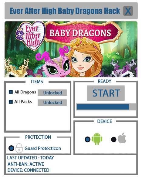 Взлом Ever After High: Baby Dragons дать вам безграничные ресурсы, деньги (различные игровые валюты, будь то золото или кристаллы), опыт и манну. Теперь пройти любой, даже самый сложный уровень становится намного проще, ведь больше не нужно накапливать средства в течении длительно времени, просто заходите в игровой магазин и покупаете то что вам нужно в данный момент, а не всякие безделушки на которые хватает денег. Кстати, взлом имеет ещё одно немаловажное преимущество, программа полностью убирает из игры назойливую встроенную рекламу, баннеры и огромные рекламные сообщения больше не будут портить ваш геймплей. Приложение весит очень мало, а с установкой сможет разобраться даже неподготовленный пользователь.