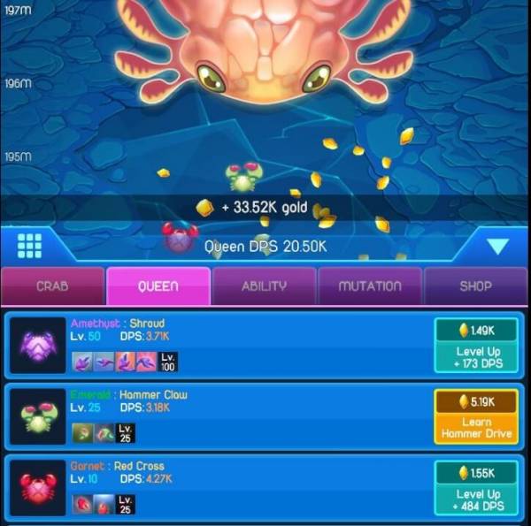 Crab Wars - захватывающий приключенческий кликер, в котором вам нужно оберегать популяцию крабов от натисков рептилий, желавших заточить крабов под землю. Результат прохождения зависит от пройденного метража, в конце вас ждет босс, за победу над которым вы получаете драгоценное золото. Его можно использовать для апгрейда характеристик. Так же в игре присутствуют несколько витком эволюции и мутации, сделавших мутанта уникальным. Чтобы произвести какие-то изменения в эволюции, просто нажмите на диаграмму во время игрового процесса. Все довольно легко и просто, и увлекательно. Кликаешь и получаешь удовольствие. Главное, чтобы заряда хватило.