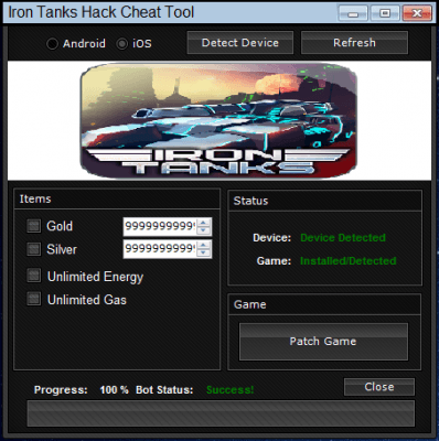 Взлом на Iron Tanks даст вам очень много денег. Воспользовавшись, приложениям вы убедитесь, что играть стало легче. Так как у вас будет много золота, серебра, энергии. С помощью этого приложения вы будете самими непобедимые.